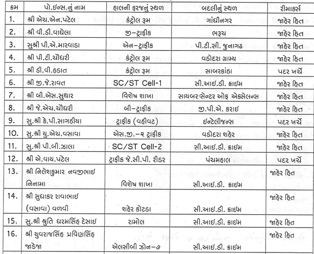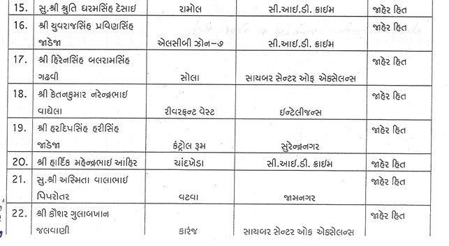 વિગતવાર માહિતી મુજબ, કંટ્રોલ રૂમમાં ફરજ બજાવતા એચ. એન. પટેલની ગાંધીનગર ખાતે અને હરદિપસિંહ જાડેજાની સુરેન્દ્રનગર ખાતે બદલી કરવામાં આવી છે. તે જ રીતે ટ્રાફિક શાખાના અનુભવી અધિકારીઓ જેવા કે વી. ડી. વાઘેલાને એન-ટ્રાફિકમાં અને જે. એચ. ચૌધરીને જી.પી.એ. કરાઈ ખાતે જવાબદારી સોંપાઈ છે. સી.આઈ.ડી. ક્રાઈમમાં પણ મોટા પાયે નિમણૂકો કરવામાં આવી છે, જેમાં જી. જે. રાવત, પી. બી. ઝાલા, નિલેશકુમાર નિનામા, સુધાકર વળવી, શ્રુતિ દેસાઈ, હાર્દિક આહિર અને એલસીબી ઝોન-7ના યુવરાજસિંહ જાડેજાનો સમાવેશ થાય છે. આ ઉપરાંત વર્તમાન સમયની ગુનાખોરીને ધ્યાને રાખી સાયબર સેન્ટર ઓફ એક્સેલન્સમાં બી. એસ. સુથાર, હિરેનસિંહ ગઢવી અને કૌશર ગુલાબખાન જલવાણી જેવા સક્ષમ અધિકારીઓને જવાબદારી સોંપવામાં આવી છે. મહિલા અધિકારીઓમાં અસ્મિતા પિપરોતરની જામનગર અને કે. પી. સાગઠીયાની ઇન્ટેલીજન્સ વિભાગમાં બદલી કરાઈ છે.