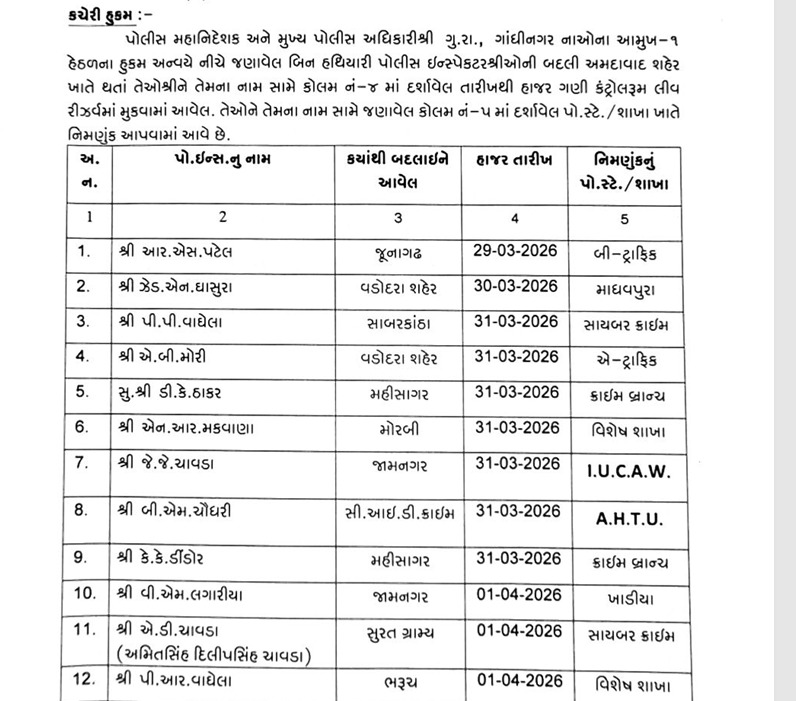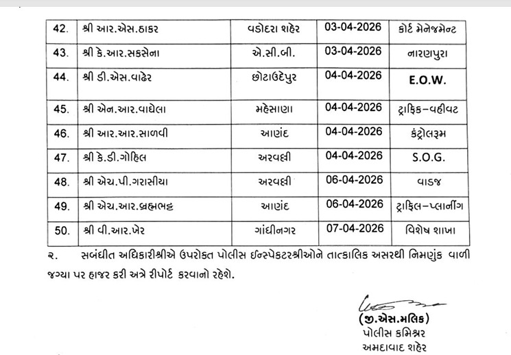 અમદાવાદ શહેર પોલીસ વિભાગમાં લાંબા સમયથી જેની ઉત્કંઠાપૂર્વક રાહ જોવાઈ રહી હતી તે પોલીસ ઇન્સ્પેક્ટરોની બદલીનો ગંજીપો આખરે પોલીસ કમિશનર જી.એસ. મલિક દ્વારા ચીપવામાં આવ્યો છે. આ મોટા ફેરબદલમાં શહેરના આંતરિક વિભાગોમાં ફરજ બજાવતા અધિકારીઓ તેમજ રાજ્યના અન્ય જિલ્લાઓમાંથી અમદાવાદ ખાતે બદલી થઈને આવેલા કુલ 60થી વધુ પોલીસ ઇન્સ્પેક્ટરોને નવા સ્થળોએ નિમણૂક આપવામાં આવી છે. ખાસ કરીને વહીવટી પ્રક્રિયા અને જાહેર હિતને ધ્યાને રાખીને કરવામાં આવેલી આ બદલીઓમાં કેટલાક વિવાદિત ચહેરાઓને પણ મહત્વના ગણાતા પોલીસ સ્ટેશનોનો ચાર્જ સોંપવામાં આવતા પોલીસ બેડામાં ભારે ચર્ચાઓ જાગી છે. આ હુકમ મુજબ, તમામ અધિકારીઓને તાત્કાલિક અસરથી પોતાની નવી જગ્યાએ હાજર થઈને રિપોર્ટ કરવા તાકીદ કરવામાં આવી છે.