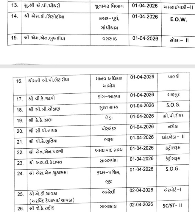 બીજી તરફ, રાજ્યના વિવિધ જિલ્લાઓ જેવા કે જૂનાગઢ, વડોદરા, જામનગર અને સાબરકાંઠાથી બદલી પામીને અમદાવાદ આવેલા બિન-હથિયારી પોલીસ ઇન્સ્પેક્ટરોને પણ કમિશનર દ્વારા યોગ્ય સ્થાને ગોઠવવામાં આવ્યા છે. મહીસાગરથી આવેલા ડી.કે. ઠાકર અને કે.કે. ડીંડોરને ક્રાઈમ બ્રાન્ચ જેવી પ્રતિષ્ઠિત પાંખમાં મૂકવામાં આવ્યા છે. આ ઉપરાંત, શહેરના સંવેદનશીલ ગણાતા ખાડિયા, દરિયાપુર અને શાહપુર જેવા વિસ્તારોમાં પણ અનુભવી અધિકારીઓને જવાબદારી સોંપવામાં આવી છે. આ સમગ્ર ફેરબદલ બાદ હવે અમદાવાદ પોલીસના કાર્યક્ષેત્રમાં નવી ઉર્જા અને કાર્યશૈલી જોવા મળે તેવી શક્યતા છે.