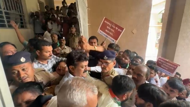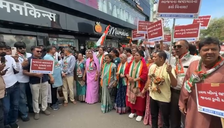 રાજકોટમાં કોંગ્રેસનો વિરોધ પ્રદર્શન : "રાજકોટનો એક જ નાદ : ભાજપના ભ્રષ્ટાચારનો કરો વિનાશ" ના પોસ્ટરો સાથે વિરોધ નોંધાવ્યો...