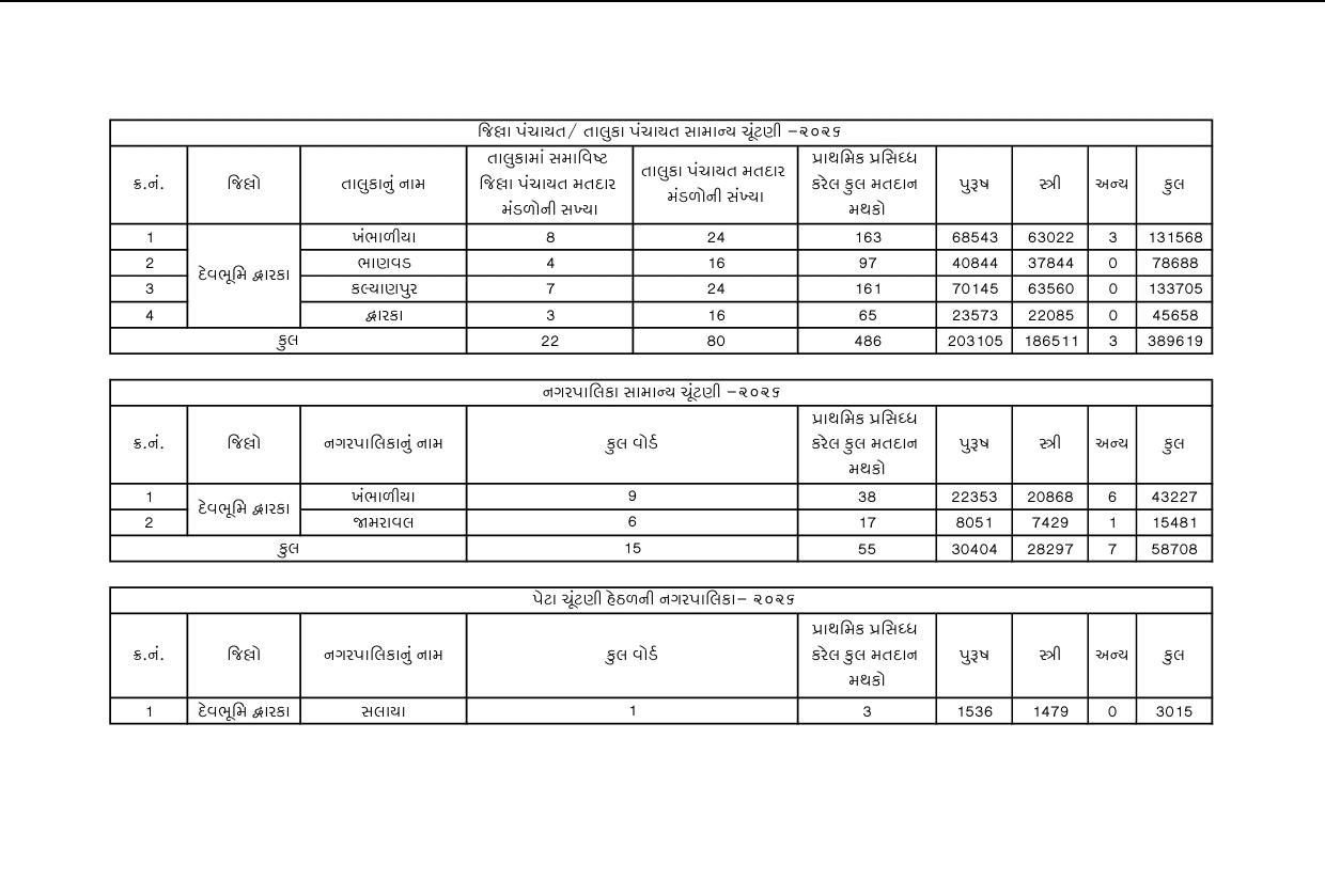 મતદારોની સંખ્યા અને સુવિધાઓની વાત કરીએ તો, દેવભૂમિ દ્વારકા જિલ્લાના કુલ 4.51 લાખથી વધુ મતદારો આ ચૂંટણીમાં પોતાના મતાધિકારનો ઉપયોગ કરી લોકશાહીને મજબૂત બનાવશે. ગ્રામ્ય સ્તરે 3,89,619 મતદારો નોંધાયા છે, જેમાં પુરુષો અને મહિલાઓ ઉત્સાહપૂર્વક સહભાગી થશે. શહેરી વિસ્તારોમાં ખંભાળીયા અને રાવલ નગરપાલિકા સહિત સલાયાની ખાલી પડેલી બેઠક પર કુલ 61,723 મતદારો મતદાન કરશે. વહીવટી તંત્ર દ્વારા મતદારોની સુવિધા માટે જિલ્લામાં કુલ 544 મતદાન મથકોની પ્રાથમિક યાદી પ્રસિદ્ધ કરવામાં આવી છે, જેમાં ખંભાળીયા તાલુકામાં સૌથી વધુ 163 મતદાન મથકો ફાળવવામાં આવ્યા છે.