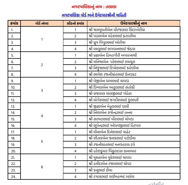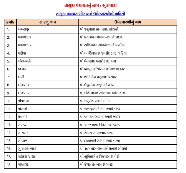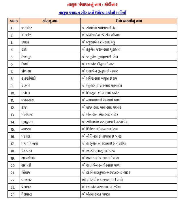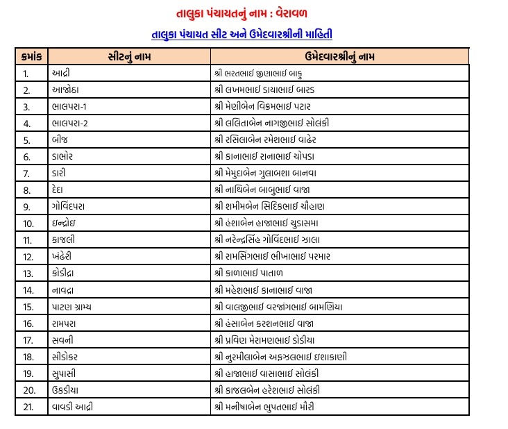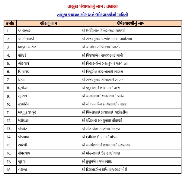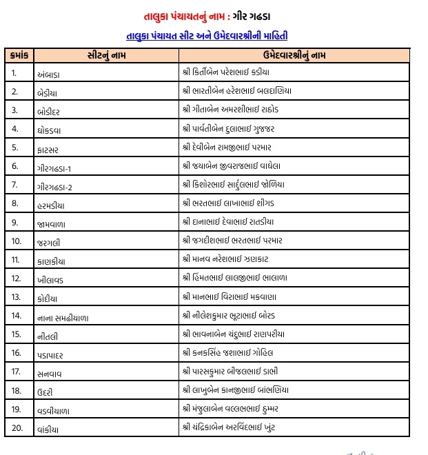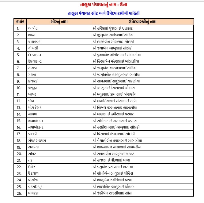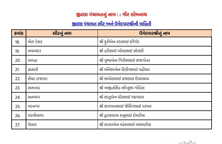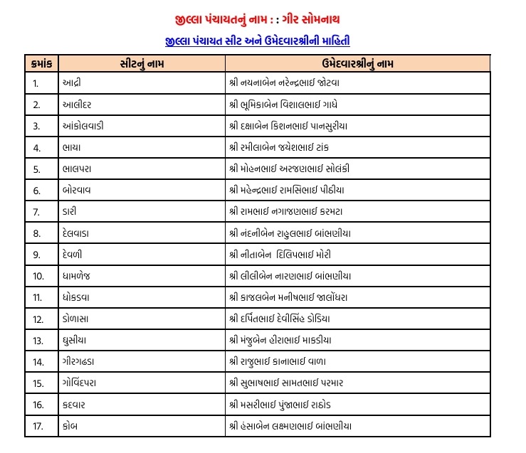 સસ્પેન્સનો અંત! ગીરસોમનાથ જિલ્લા પંચાયત, તાલુકા પંચાયતમાં ઉના, તલાલા અને વેરાવળ સહિતની બેઠકોની ચૂંટણી માટે ભાજપના ઉમેદવારોના નામ જાહેર...