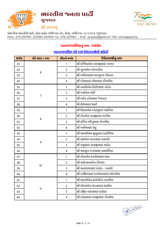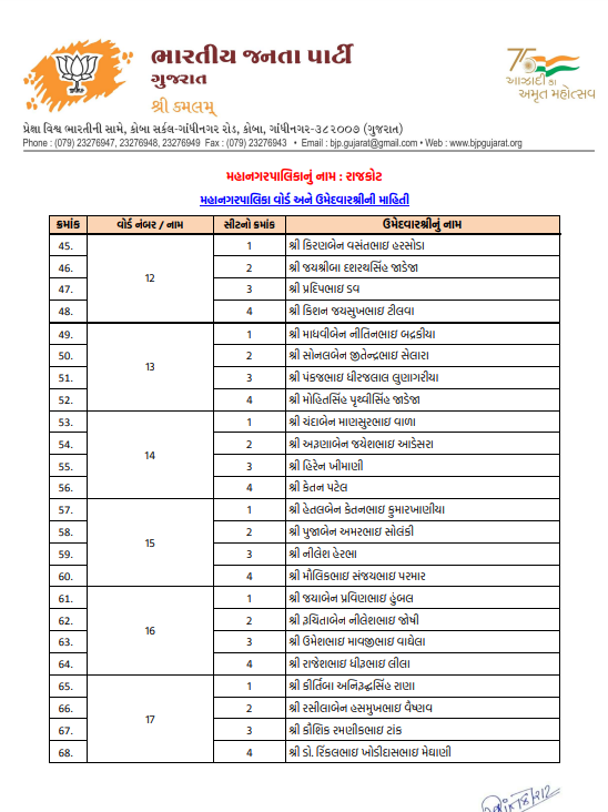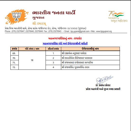 રાજકોટ મહાનગરપાલિકાની ભાજપની યાદી જાહેર, 18 વોર્ડના 72 ઉમેદવારો જાહેર, વિવાદમાં રહેલા મેયર નયના પેઢડિયાની ટિકિટ કપાઈ