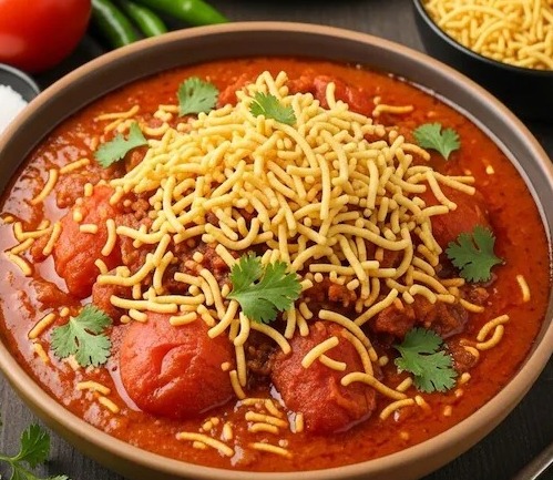 આ વાનગી બનાવવા માટે કોઈ ખાસ સામગ્રીની જરૂર પડતી નથી, બધી જ વસ્તુઓ રસોડામાં સરળતાથી મળી રહે છે. મુખ્ય સામગ્રીમાં લાલ પાકા ટામેટાં અને બેસનની સેવનો ઉપયોગ થાય છે. આ ઉપરાંત તેલ, રાઈ, જીરું, હિંગ, હળદર, લાલ મરચું પાવડર, ધાણાજીરું, આદુ-મરચાની પેસ્ટ અને સ્વાદ મુજબ મીઠું જરૂરી છે. જો તમને ગુજરાતી સ્વાદ ગમતો હોય, તો ગ્રેવીમાં થોડો ગોળ અથવા ખાંડ ઉમેરી શકાય છે.