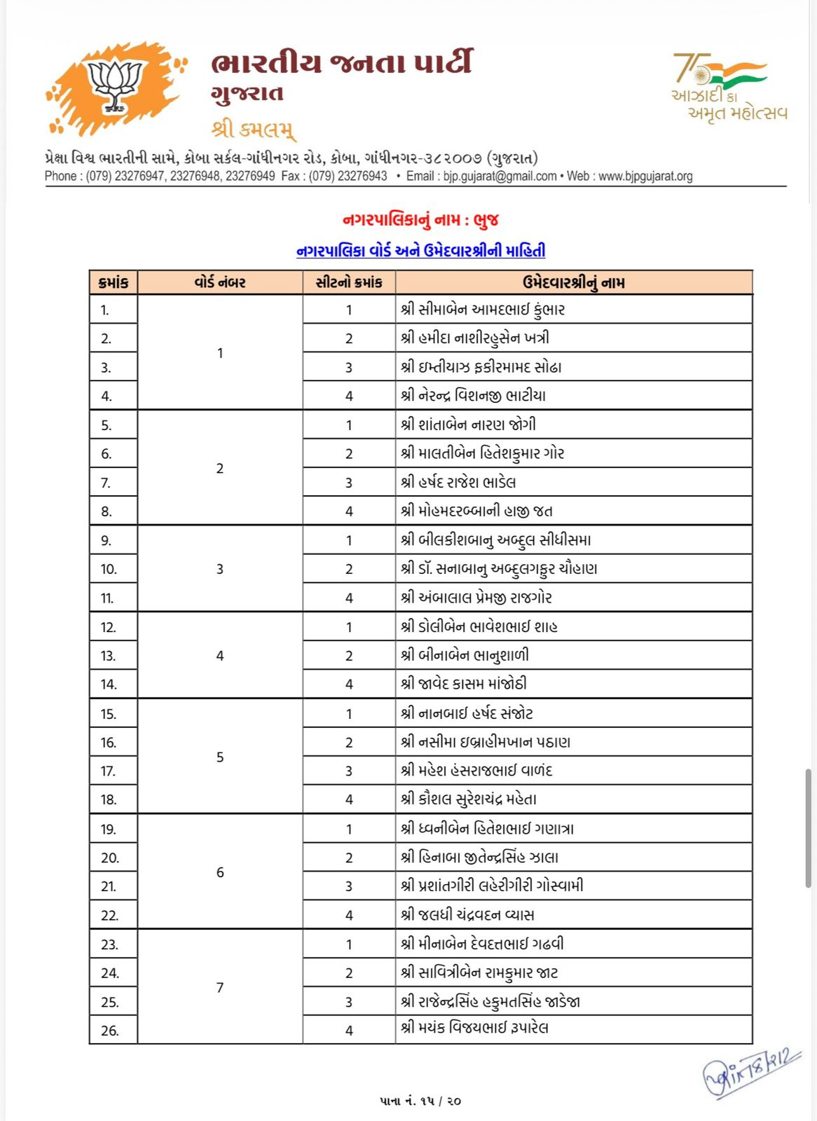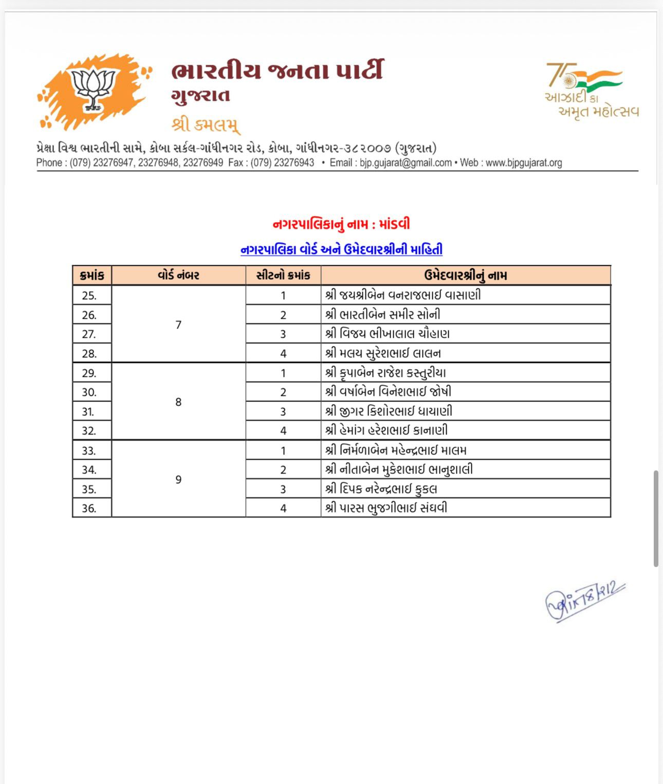 વોર્ડ 6 પૂર્વ કારોબારી ચેરમેન જલધિ વ્યાસ, વોર્ડ 8 મનીષાબેન સોલંકી અને મનુભા જાડેજા, વોર્ડ 11 બિંદીયા ઠક્કર, કમલ ગઢવી અને ધર્મેશ જોષીને રિપીટ ટિકિટ આપવામાં આવી છે.