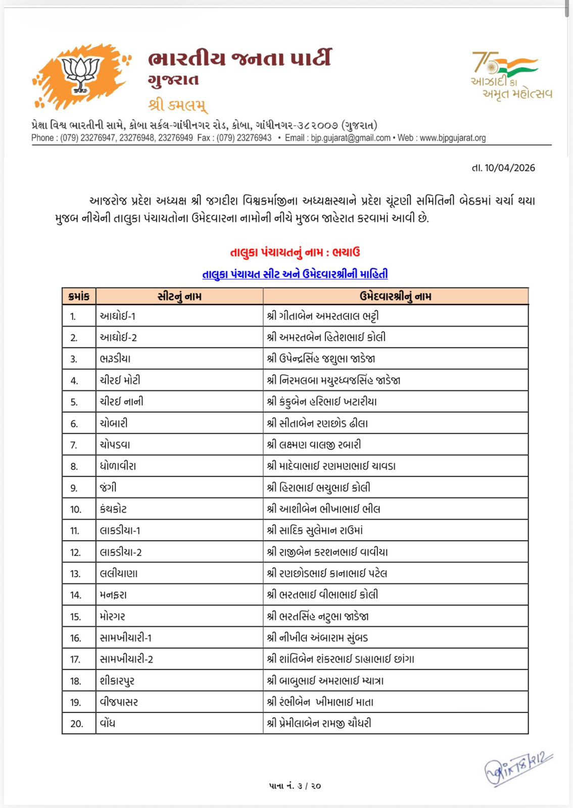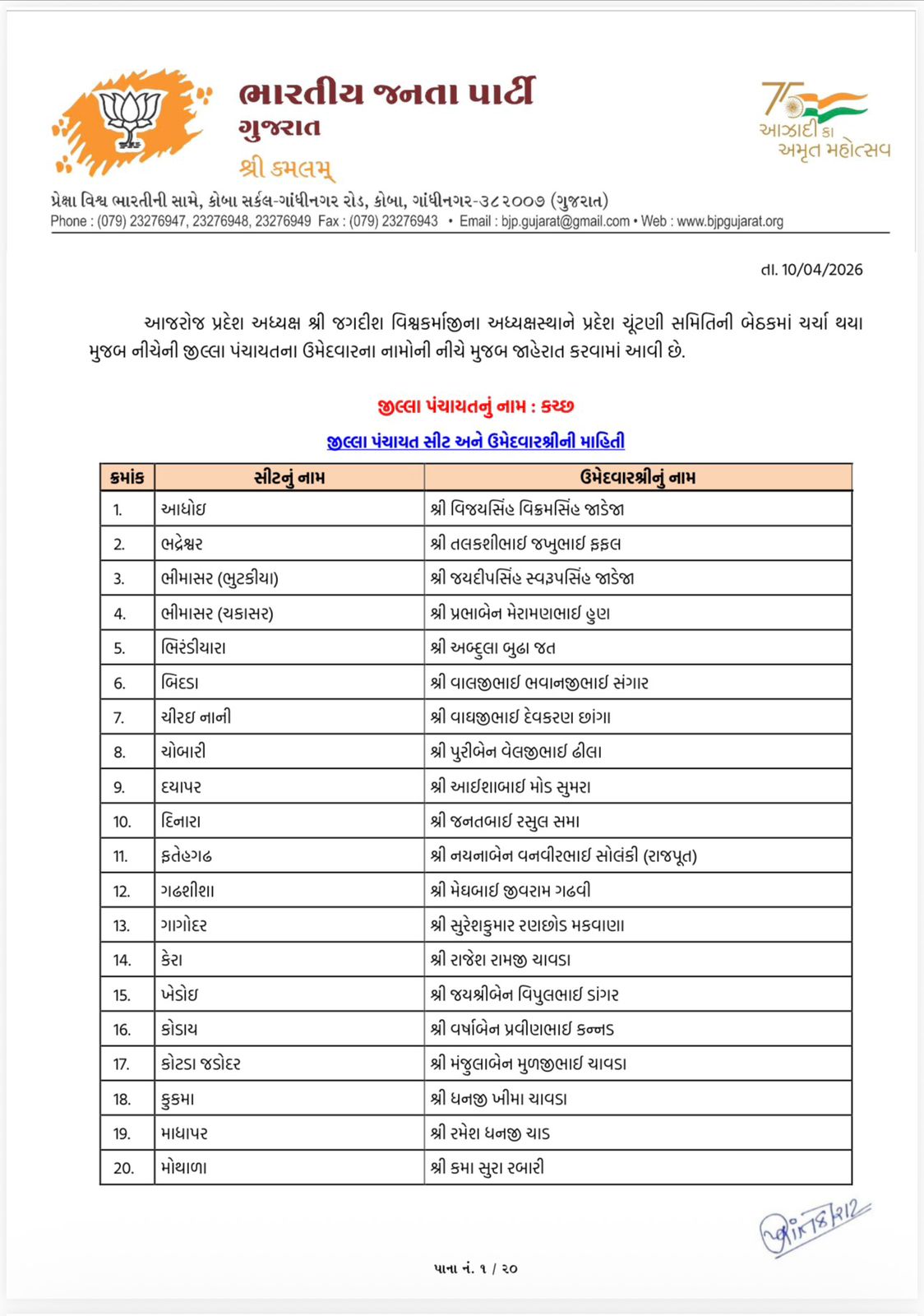 કચ્છના વિકાસની કમાન સોંપવા ભાજપ તૈયાર : જિલ્લા પંચાયત, નગરપાલિકા અને તાલુકા પંચાયતની ચૂંટણી માટે ઉમેદવારો નામ જાહેર...