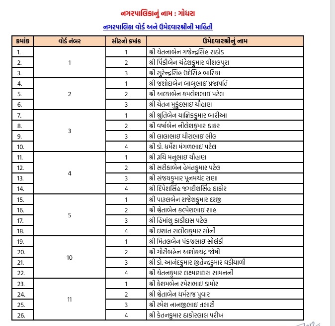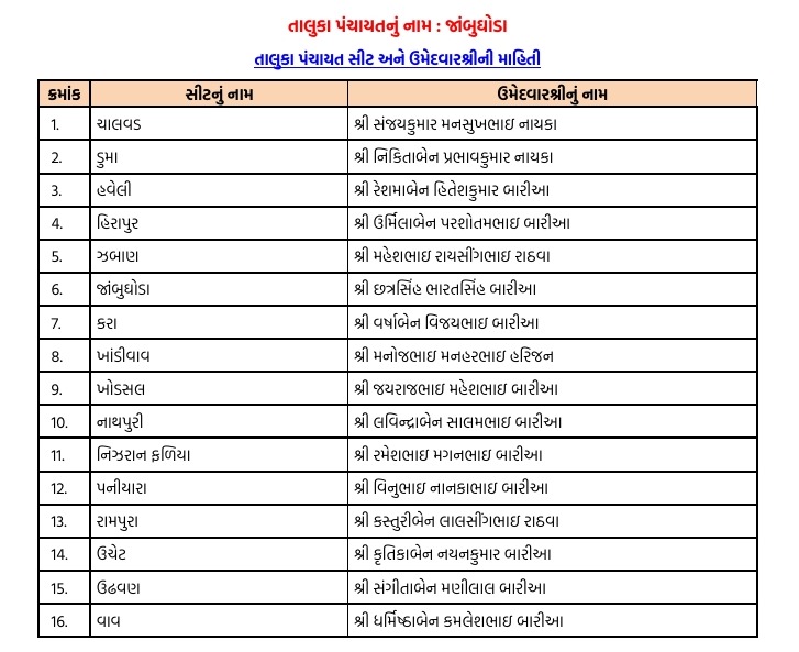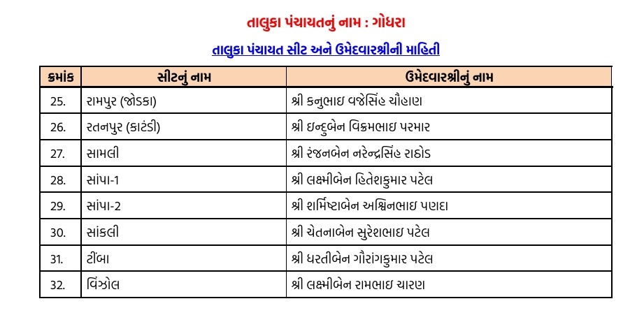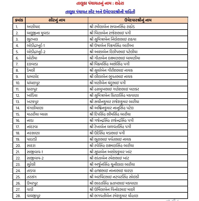 તાલુકા સ્તરે વહીવટી પ્રક્રિયા વધુ સુદ્રઢ બને તે હેતુથી ધોધંબા, ગોધરા, હાલોલ, જાંબુઘોડા, કાલોલ, મોરવા હડફ અને શહેરા તાલુકા પંચાયતો માટે પણ ઉમેદવારોના નામો જાહેર કરાયા છે. આ સાતેય તાલુકાઓમાં સ્થાનિક પ્રશ્નો અને પ્રજાની અપેક્ષાઓને સમજી શકે તેવા લાયક પ્રતિનિધિઓની પસંદગી કરવા માટે પ્રદેશ ચૂંટણી સમિતિએ પાયાના સર્વેક્ષણોનો આધાર લીધો હતો. આ ઉપરાંત, શહેરી વિસ્તારોમાં પકડ જાળવી રાખવા માટે ગોધરા અને શહેરા નગરપાલિકાના ઉમેદવારોના નામો પર પણ આખરી મહોર મારી દેવામાં આવી છે. નગરપાલિકા સ્તરે સ્વચ્છતા, પાણી અને પાયાની સુવિધાઓના મુદ્દે જે તે વિસ્તારમાં લોકપ્રિય હોય તેવા કાર્યકરોને તક આપીને ચૂંટણી મેદાનમાં ઉતારવાનો વ્યૂહ ઘડવામાં આવ્યો છે. આ જાહેરાત સાથે જ કાર્યકરોમાં નવો ઉત્સાહ જોવા મળી રહ્યો છે અને હવે પ્રચાર પ્રસારની કામગીરી વેગીલી બનશે.