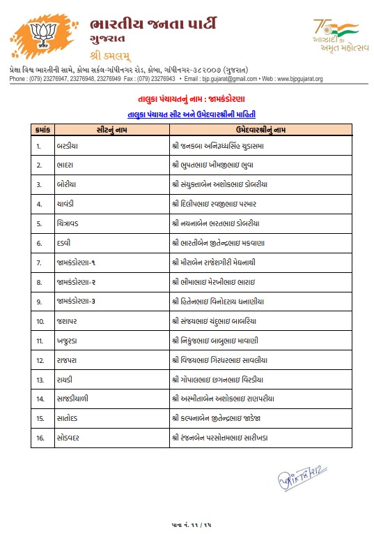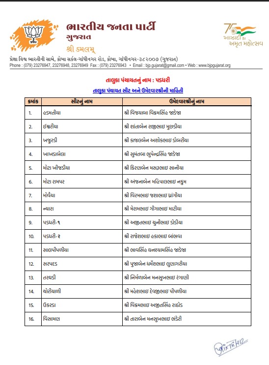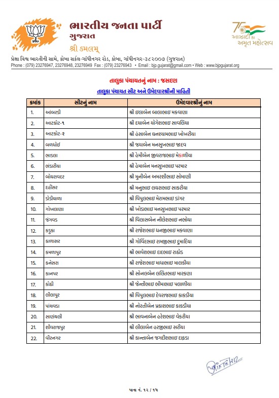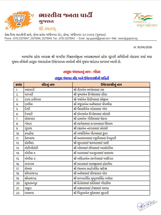 ગુજરાતમાં સ્થાનિક સ્વરાજ્યની ચૂંટણીના જંગ માટે બ્યૂગલ વાગી ચૂક્યું છે, ત્યારે ભાજપે લાંબી મથામણ અને આંતરિક ખેંચતાણ બાદ આખરે રાજકોટ જિલ્લા પંચાયત અને તાલુકા પંચાયત માટે પોતાના મૂરતિયાઓના નામ જાહેર કરી દીધા છે. ઉમેદવારી પત્ર ભરવાની અંતિમ તારીખના માત્ર 24 કલાક પહેલાં જ ઉમેદવારોની યાદી જાહેર થતા રાજકીય ગરમાવો ચરમસીમાએ પહોંચ્યો છે. પ્રદેશ નેતૃત્વ અને સ્થાનિક સંગઠન વચ્ચે ચાલેલી મેરેથોન બેઠકો બાદ તમામ બેઠકોના સમીકરણોને ધ્યાને રાખીને આખરી યાદીને મંજૂરી આપવામાં આવી છે.